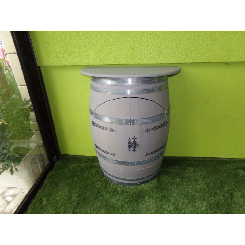 Bar en Demi Barrique 225l en chêne en forme de clair de lune. Avec 2 portes, 1 étagère, 1 plateau supérieur de 0.80 m de longueur et 0.40 m de large