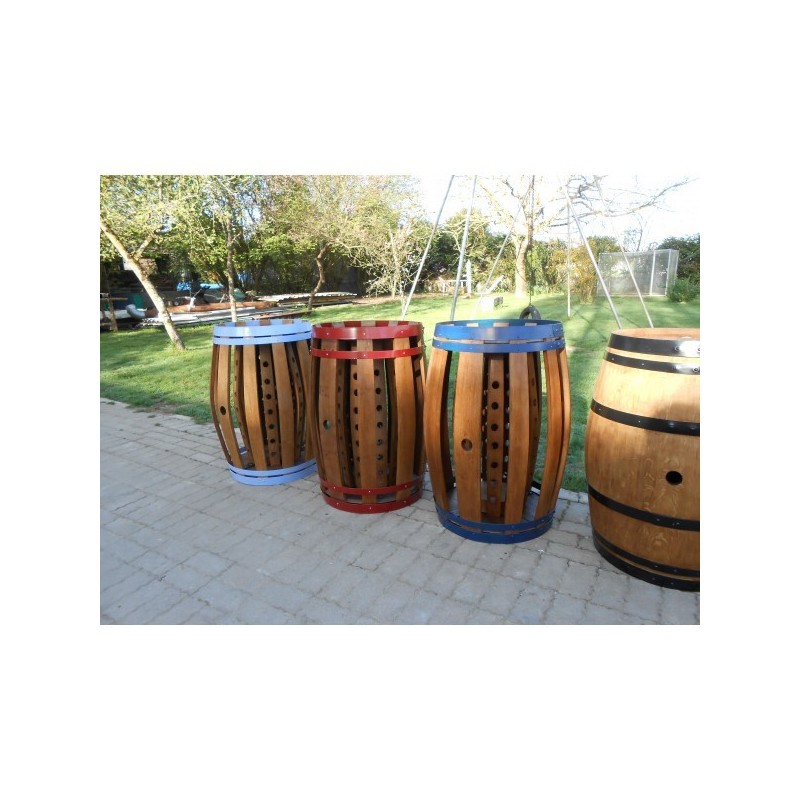 Meuble casier à bouteilles, sur base d'une barrique en chêne, agencement possible de 90 à 100 bouteilles, hauteur de 1m, et diamétre hors bouteilles 70 cm, poids 50 kg environ, teinte sur demande